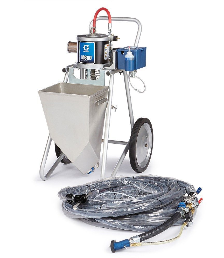 Η αντλία κονιαμάτων Graco ToughTek M680 χειρίζεται λειαντικά υλικά όπως εποξειδικά κονιάματα, αντιολισθητικές επικαλύψεις ή υλικά από τσιμέντο.